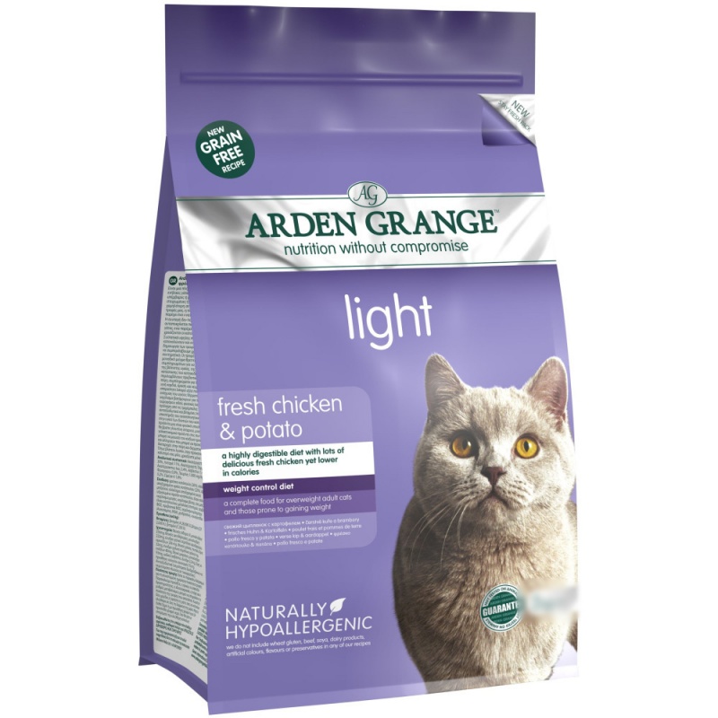 Arden Grange Adult Cat Light - високоякісний повноцінний сухий корм супер преміум класу для дорослих кішок усіх порід з низьким рівнем фізичної активності, з надмірною масою тіла або схильних до повноти (стерилізовані тварини, що живуть у приміщенні). Порівняно зі стандартним харчуванням, у кормі знижений вміст калорій і жирів, але завдяки великій кількості свіжого курячого м'яса, він смачний, легко засвоюваний і дуже корисний.