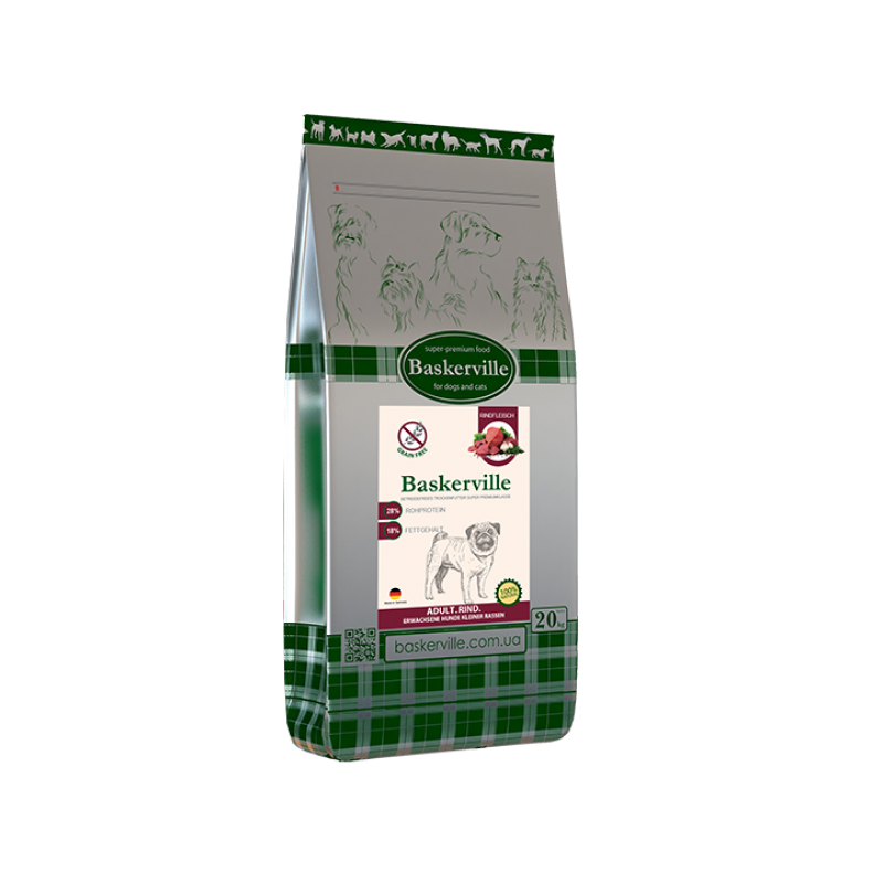 Баскервіль. Яловичина з ягодами. Беззерновий сухий корм супер-преміум класу для дорослих собак дрібних порід. Склад: м'ясо яловичини 22%, м'ясні субпродукти, сухі ягоди (суміш), олії ти жири тваринного походження, пивні дріжджі, батат, продукти переробки рослинного походження, картопляні пластівці, вітаміни, мінерали та мікроелементи. Аналітичний склад: сирий протеїн 28%; сирий жир 18%; сира клітковина 2,7%; сира зола 10%; волога 9%; кальцій 18%; фосфор 1%; натрій 0,60%; Омега-3 2,8 г; Омега-6 24,1г