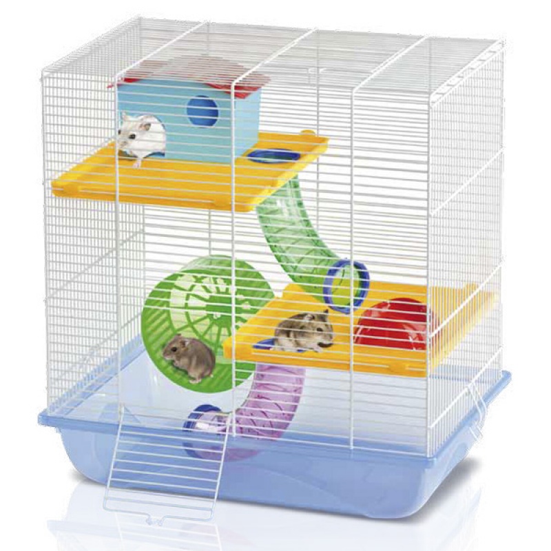 Двухъярусная клетка для хомяков, песчанок и других мелких грызунов. Клетка для грызунов Imac Criceti 7укомплектована всеми необходимыми аксессуарами для комфортного содержания хомяков и песчанок. Клетка содержит кормушку, 2 большие платформы с нескользящим покрытием, 2 игровые трубы для перехода между ярусами, домик, беговое колесо. Поддон в клетке пластиковый, отлично моется и не впитывает запахи.