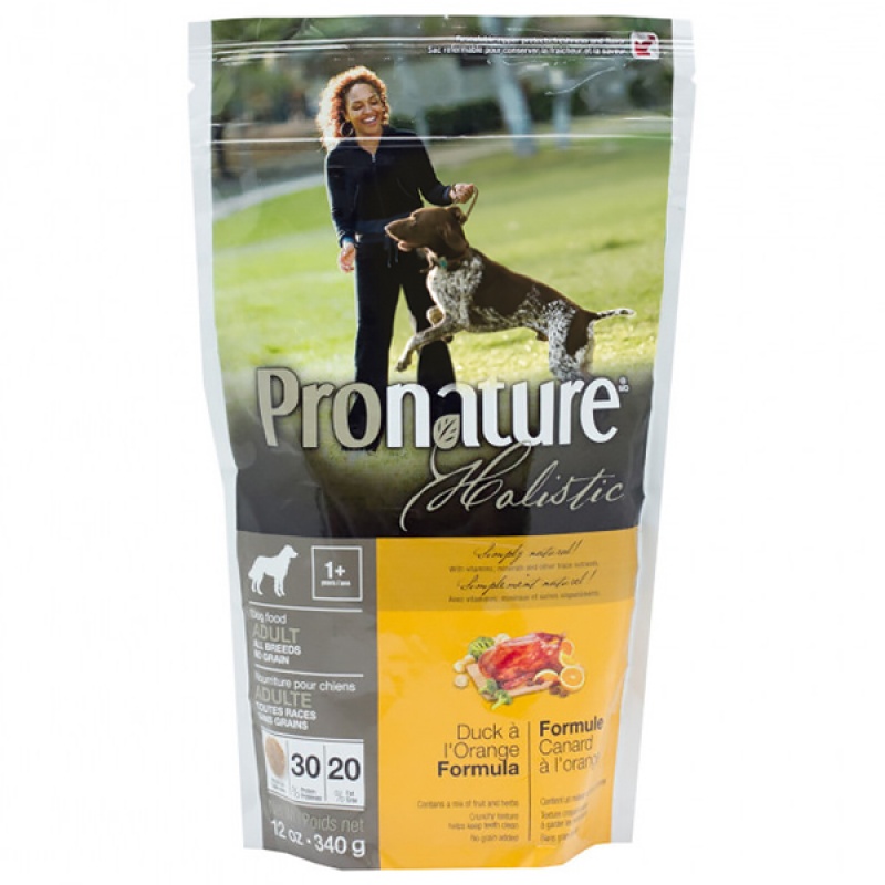 Універсальний корм Pronature Holistic з качкою та апельсинами характеризується унікальною рецептурою. Формула корму повністю виключає з раціону злаки, які можуть спровокувати алергію чи труднощі з харчовою прохідністю. Рекомендується для собак віком від 12 місяців та старше.