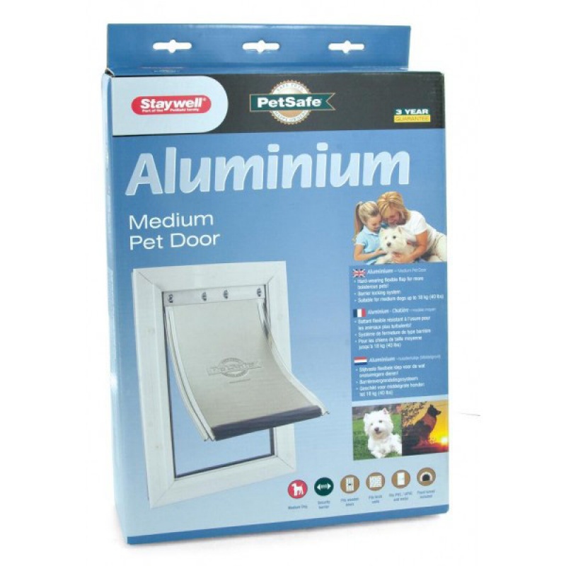 Двері для собак Staywell серії 600 виготовлені із міцного алюмінію. Гнучкий клапан дверей створює мінімум шуму. У комплекті замок для замикання дверцят. Можна використовувати для вхідних дверей або міжкімнатних дверей.